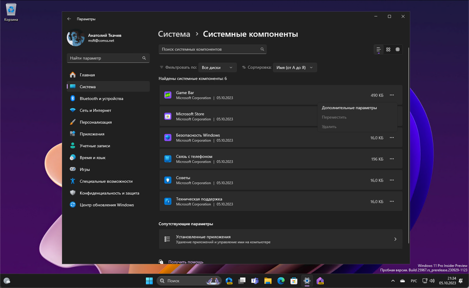 - В разделе "Параметры" компоненты системы, которые ранее были перечислены на странице "Параметры" > "Приложения" > "Установленные приложения", теперь переехали на свою собственную страницу в "Параметры" > "Система" > "Системные компоненты".