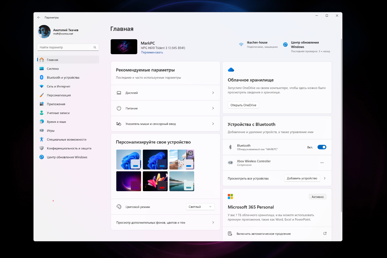 В этой версии представлена новая домашняя страница "Главная" в приложении "Параметры", которая предлагает динамичный и персонализированный опыт. Она предоставляет обзор вашего устройства, быстрый доступ к ключевым настройкам и помогает управлять вашей учетной записью Microsoft.