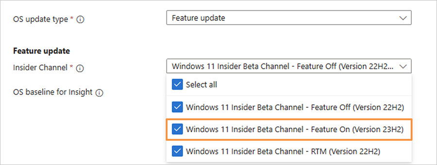 В Test Base появилась возможность тестирования Windows 11, версия 23H2, для чего необходимо перейти в раздел Feature update, затем в Insider Channel и в выпадающем списке выбрать опцию Feature On (с выходом новых функций).