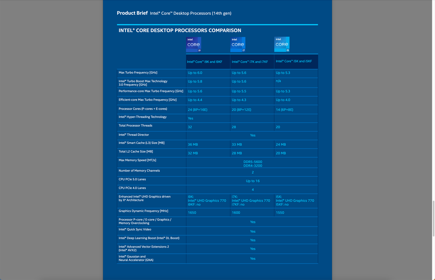- Core i9-14900K с 24 (8P и 16E) ядрами, 32 потоками и максимальной частотой 6 ГГц., 36 МБ кэш-памяти и графикой Intel UHD 770.