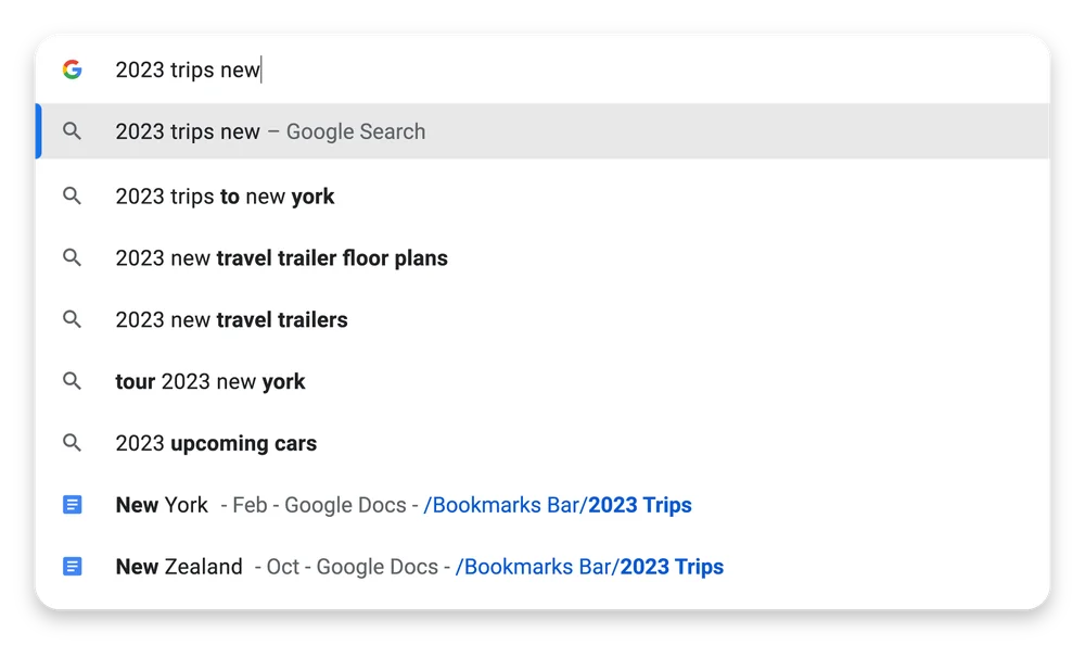 Если вы разложили закладки по папкам, то теперь вам не нужно открывать менеджер закладок или панель закладок и вручную выбирать избранные папки. Вы можете легко найти то, что ищете, в адресной строке Chrome. Достаточно указать имя папки, и в предложениях среди прочих результатов появится страница с закладкой.