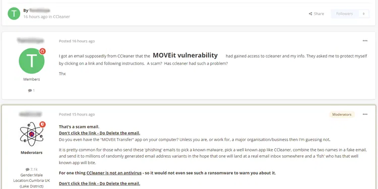 Еще один пользователь поинтересовался, действительно ли CCleaner рассылает подобные письма, на что один из администраторов форума ответил, что это мошенническое письмо и пользователям следует его проигнорировать.