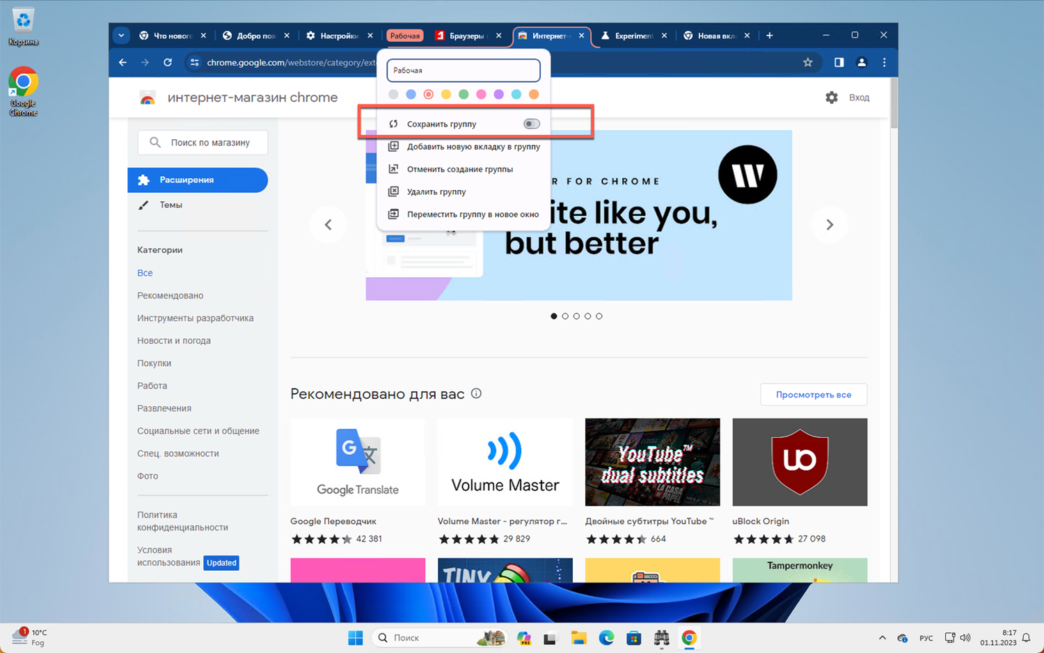 Google Chrome 119 получил ряд новых функций и улучшений. Например, теперь поддерживается сохранение и синхронизация групп вкладок.