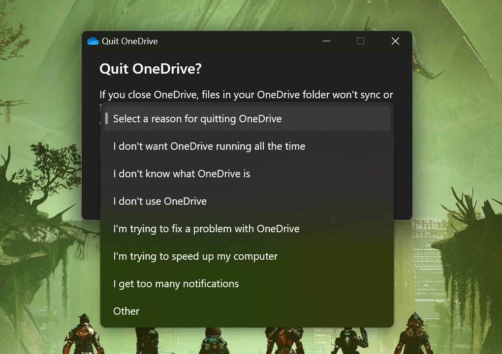 Microsoft теперь позволит закрыть приложение OneDrive только после того, как вы объясните свое намерение. В последнем обновлении OneDrive появилось назойливое диалоговое окно, которое просит выбрать причину закрытия приложения при каждой попытке закрыть OneDrive с панели задач.