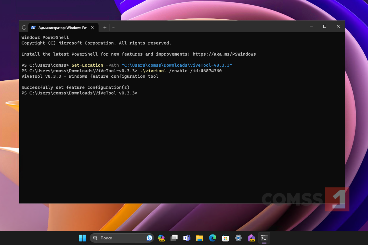 В примерах используются команды в Терминале для профиля PowerShell . Если вы используете профиль Командная строка, замените начальную команду .\vivetool на vivetool.