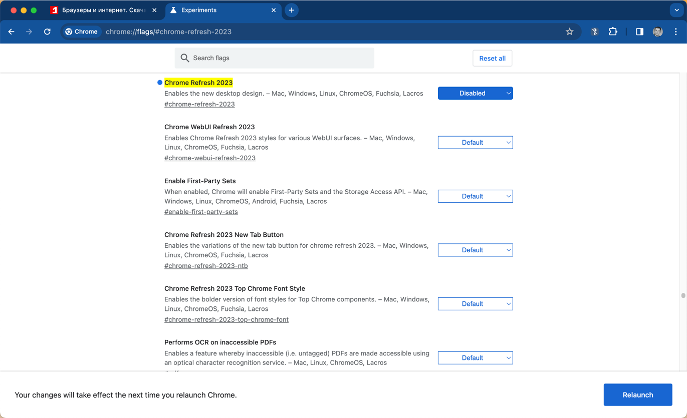 chrome://flags/#chrome-refresh-2023, чтобы открыть страницу экспериментальных флагов. - Установите статус флага Chrome Refresh 2023 в значение Disabled.