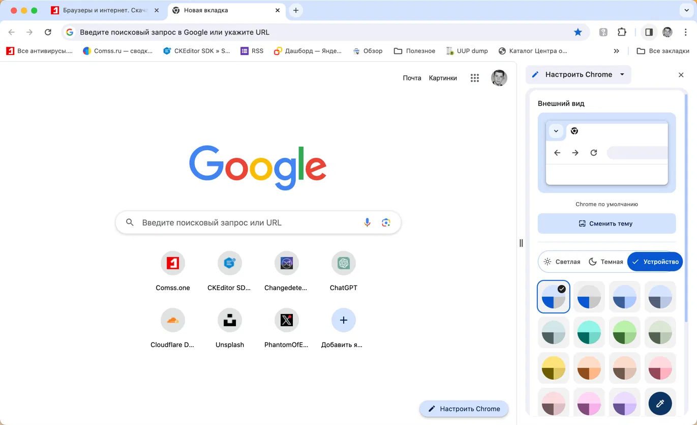 Чтобы сменить тему, нужно открыть страницу новой вкладки и выбрать опцию Настроить Chrome. По умолчанию доступно 16 различных тем оформления. Первая серо-белая тема больше всего напоминает старый вид Chrome.