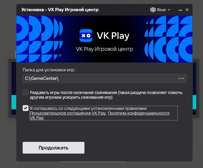 В появившемся окне игрового центра VK Play согласитесь на установку.