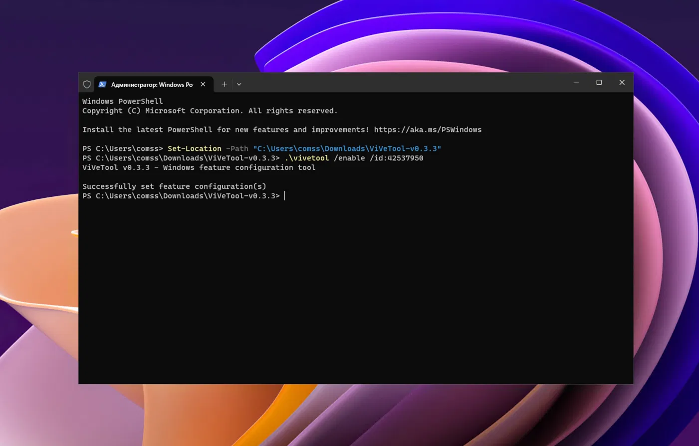 В примерах используются команды в Терминале для профиля PowerShell . Если вы используете профиль Командная строка, замените начальную команду .\vivetool на vivetool.