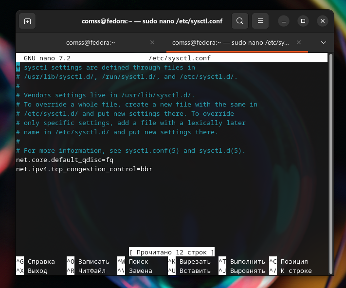После добавления этих строк сохраните файл и примените изменения с помощью команды sudo sysctl -p.