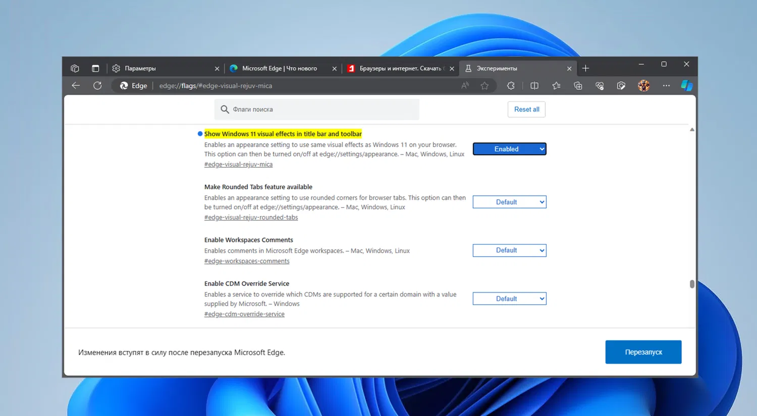 edge://flags/#edge-visual-rejuv-micaи нажмите Enter. - Найдите флаг "Show Windows 11 visual effects in title bar and toolbar" (Показывать визуальные эффекты Windows 11 в строке заголовка и панели инструментов).