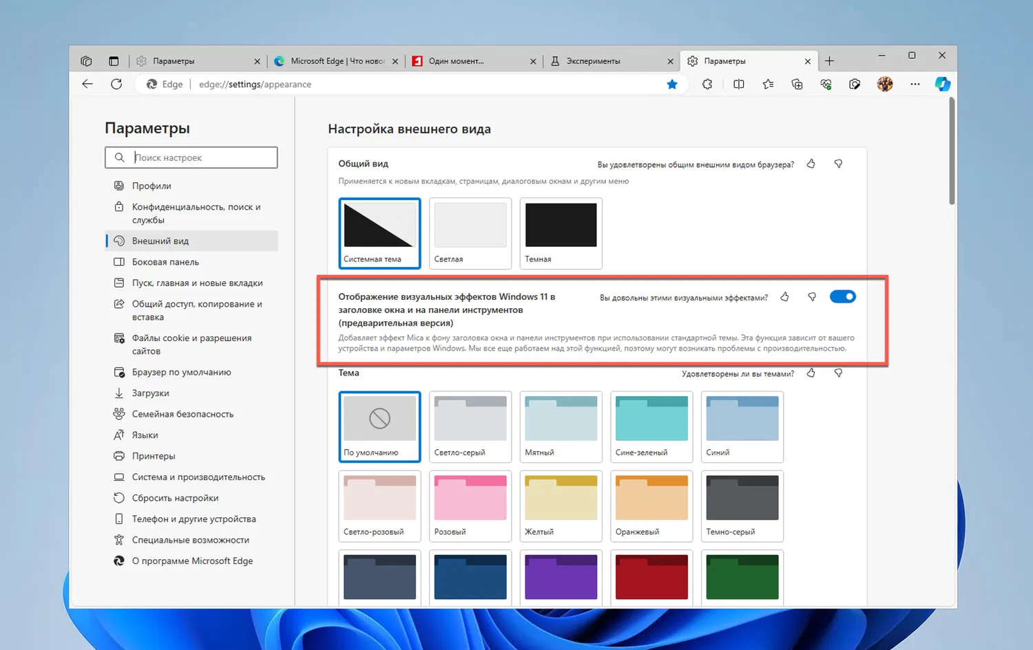edge://settings/appearanceв адресной строке. - Включите опцию Отображение визуальных эффектов Windows 11 в заголовке окна и на панели инструментов (предварительная версия). Она доступна для включения при использовании стандартной темы