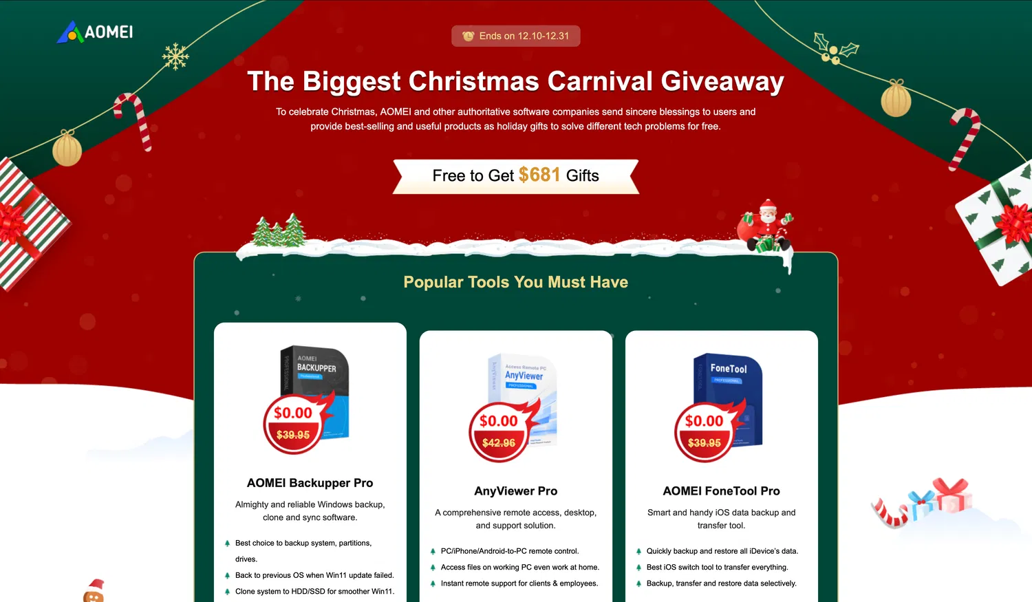 AOMEI проводит акцию "Крупнейший Рождественский карнавал раздач", в рамках которой вместе с другими разработчиками программного обеспечения предлагают пользователям бесплатные праздничные подарки – популярные и полезные продукты, которые помогут решить различные технические задачи.