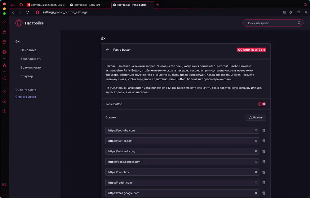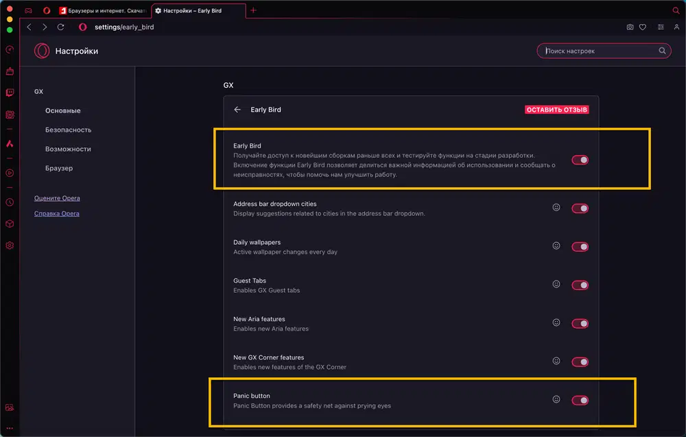opera://settings/early_birdи активируйте функцию Early Bird. - Включите Panic Button и перезапустите Opera.