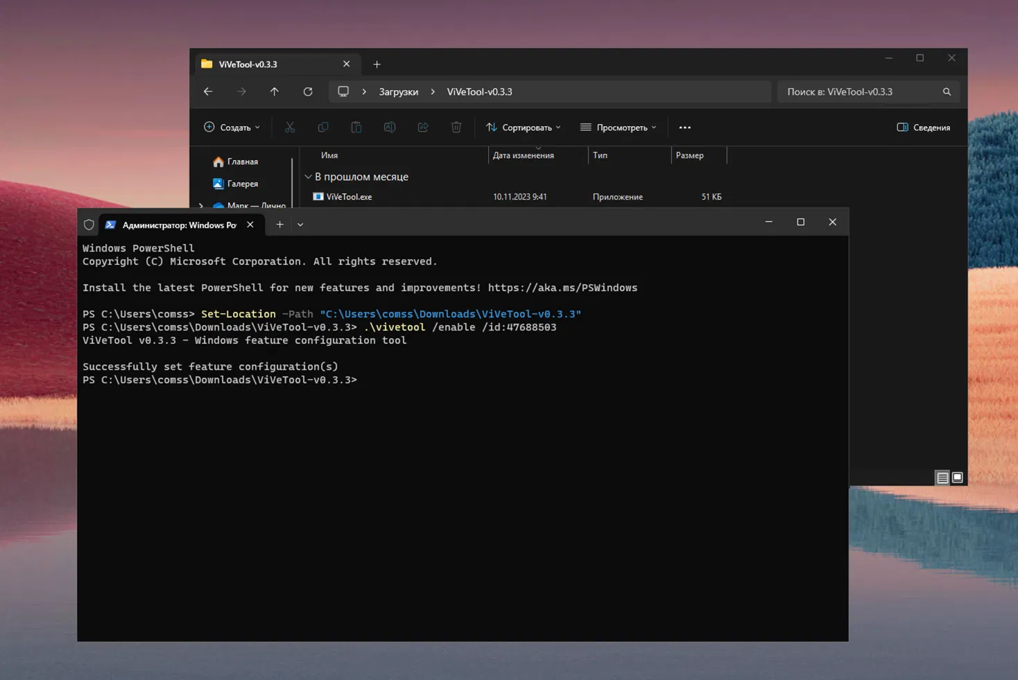 В примерах используются команды в Терминале для профиля PowerShell . Если вы используете профиль Командная строка, замените начальную команду .\vivetool на vivetool.