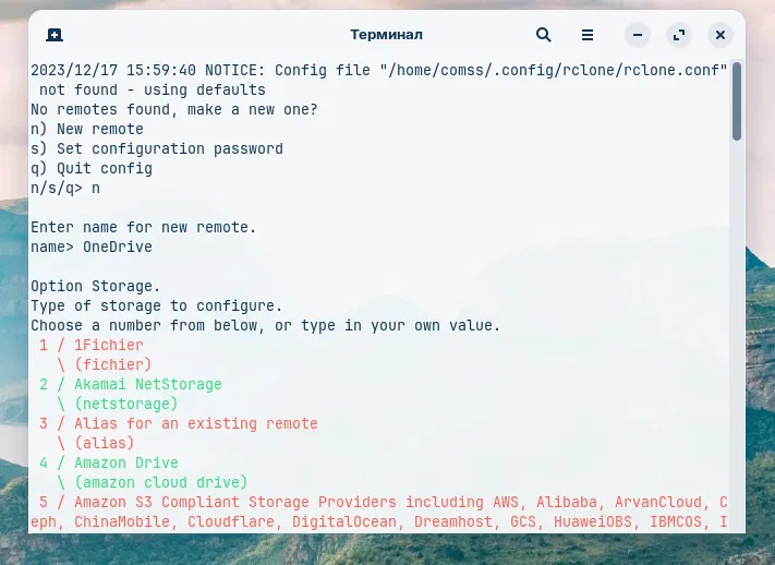 - Enter name for new remote. – Задаем название. В нашем случае OneDrive