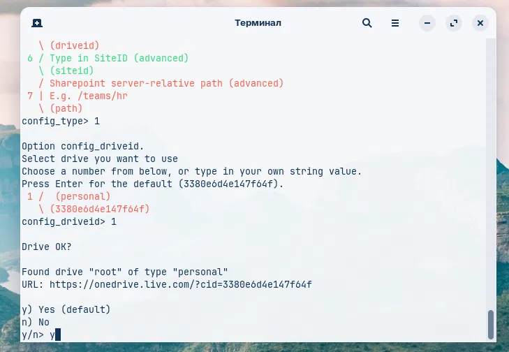 - Keep this "OneDrive" remote? – подтверждаем правильность конфига и выбираем y (yes)
