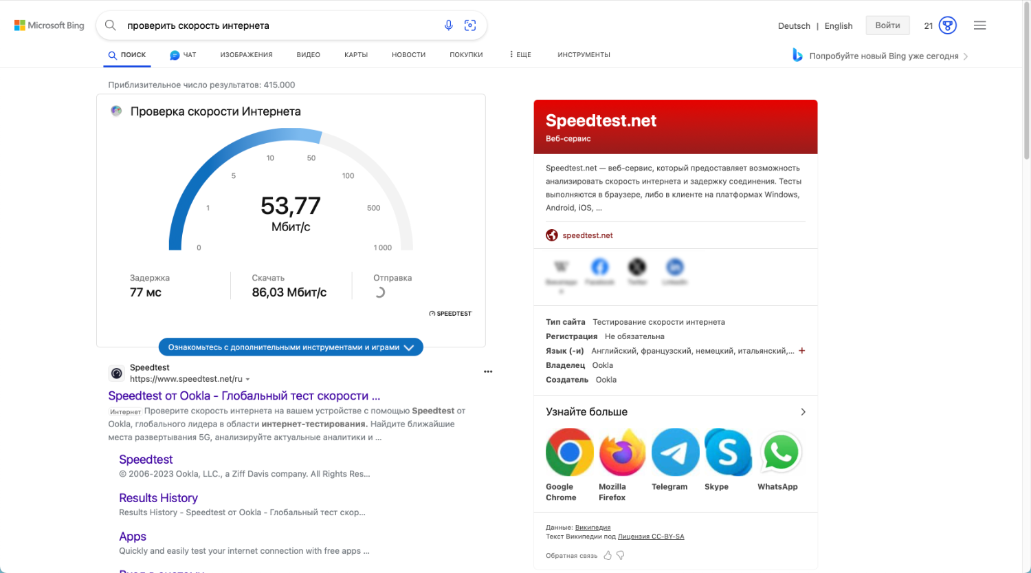 Теперь Microsoft отказалась от собственного теста скорости Интернета для Bing и перешла на виджет популярного сервиса Speedtest.net от компании Ookla.