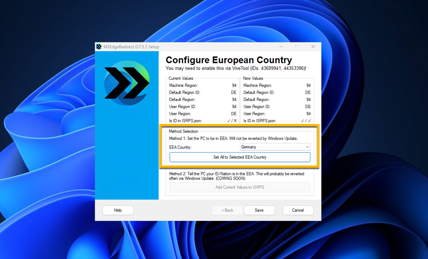 Изменения, внесенные с помощью MSEdgeRedirect, не чувствительны к обновлениям Windows. В следующей версии MSEdgeRedirect появится еще один метод для смены владельца и изменения одного из системных файлов, чтобы Windows считала, что ваша настоящая страна является членом Европейского Союза (ЕС). Таким образом, вы сможете удалить Edge несколькими щелчками мыши, оставив региональные настройки нетронутыми.