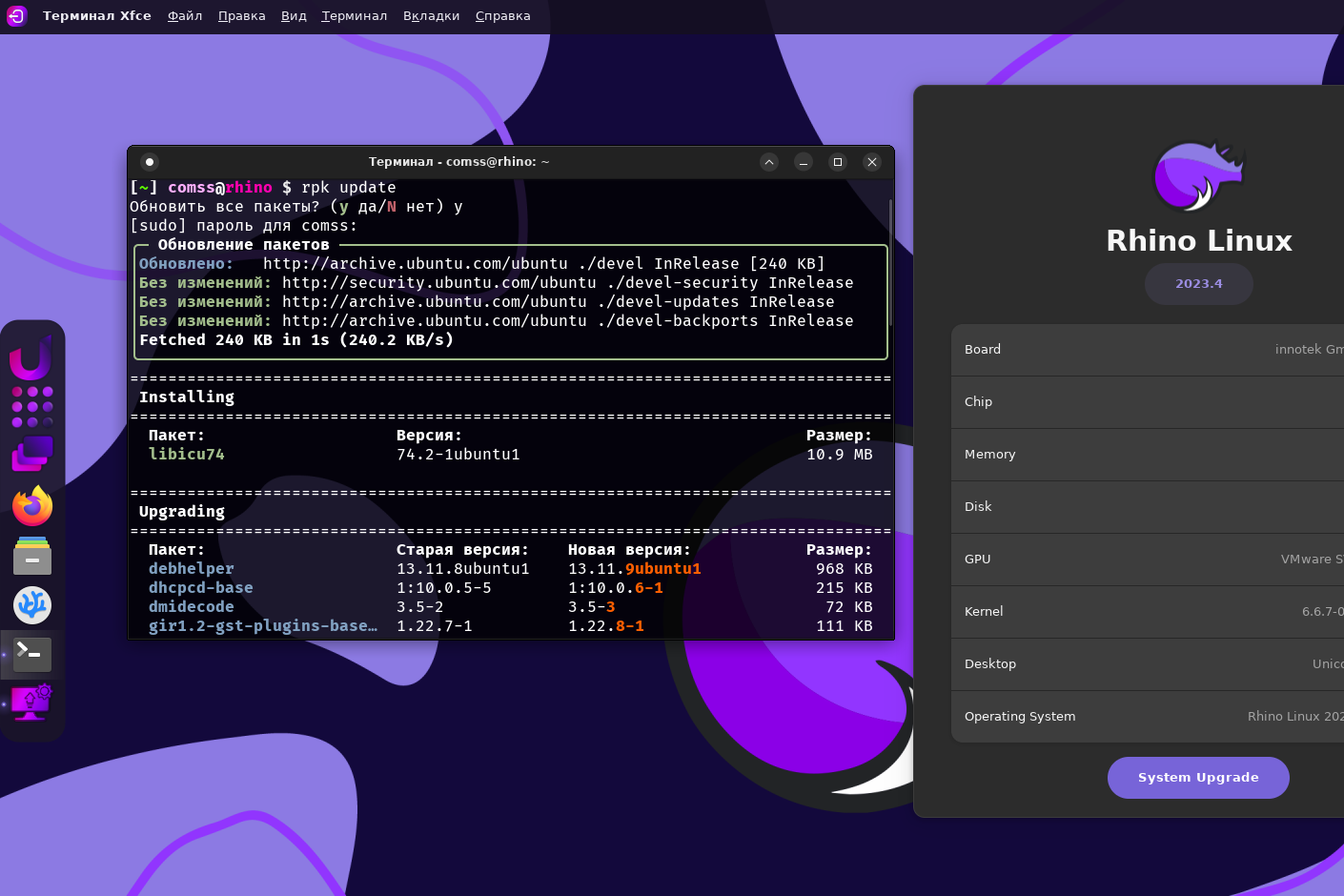 - Rhino Linux 2023.4, основанный на Ubuntu, представляет собой Rolling Release дистрибутив с новым рабочим окружением Unicorn Desktop на базе Xfce.