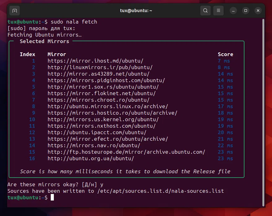 Команда nala fetch работает аналогично netselect и netselect-apt в большинстве случаев. Но nala fetch определит, используете ли вы операционной системой Debian или Ubuntu . Затем Nala проверит все зеркала из каждого основного списка. После этого инструмент выполнит тест на задержку и присвоит оценку каждому зеркалу. Наконец, три самых быстрых зеркала будут выбраны и записаны в файл конфигурации.