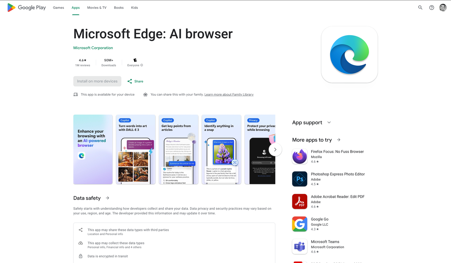 Microsoft Edge не является самым популярным браузером на мобильных устройствах, частично из-за отсутствия собственной мобильной платформы у Microsoft. Несмотря на это, приложение имеет более 50 миллионов загрузок на Android с рейтингом 4.6 и рейтингом 4.7 в App Store Apple, хотя там не указаны данные о загрузках.