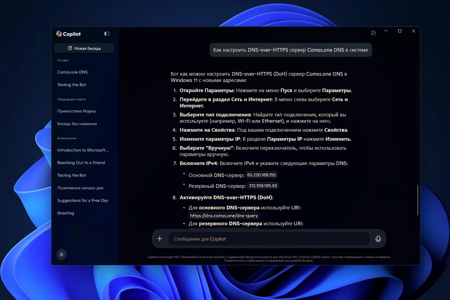 - При использовании Comss.one DNS ИИ-помощник Copilot будет работать в Windows 11 без ограничений.