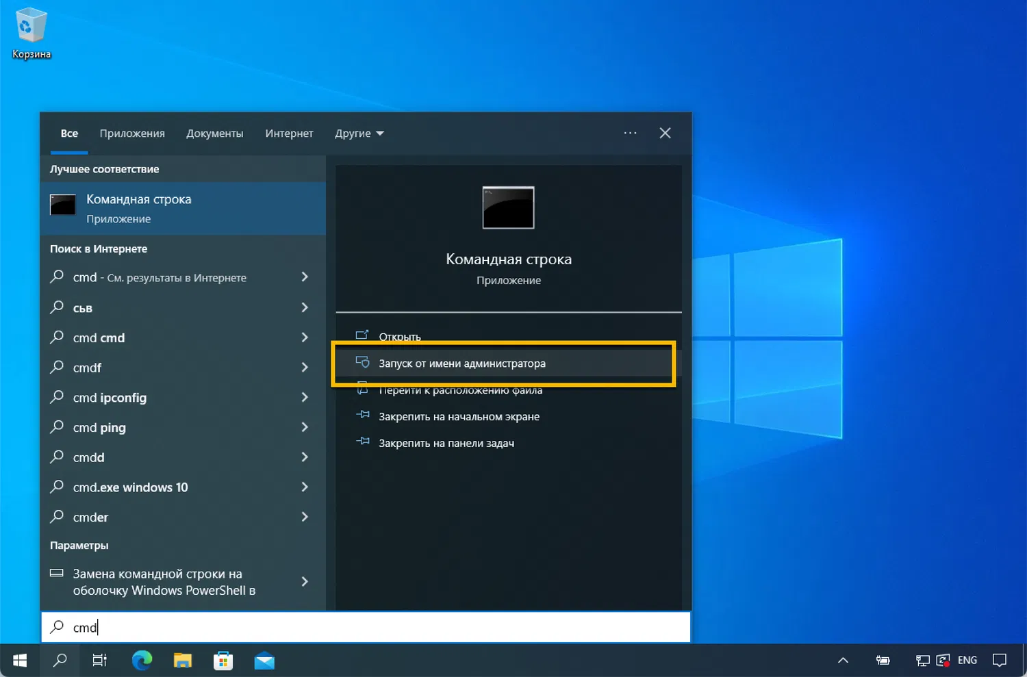 - Введит в поиск меню "Пуск" cmd и выберите Командная строка > Запуск от имени администратора.