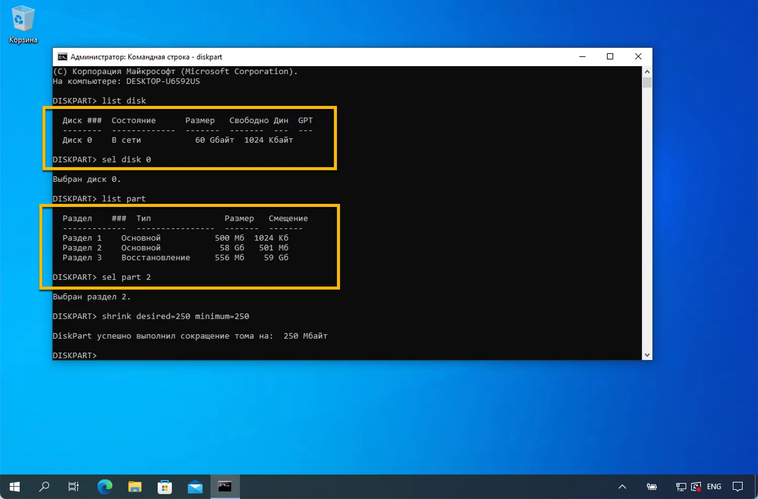 - Введите shrink desired=250 minimum=250