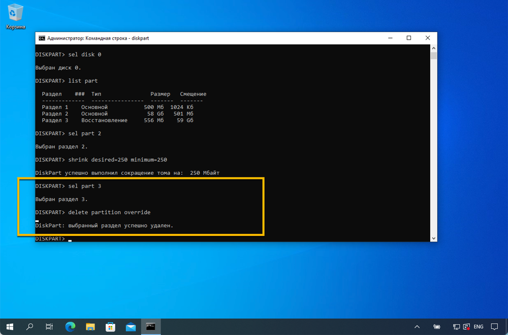 Удаление раздела WinRE