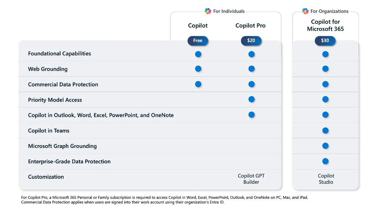 Ниже показана сравнительная таблица с различиями между бесплатным Copilot, Copilot Pro и Copilot для Microsoft 365.