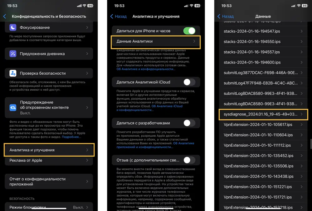 - Сбор данных: Пользователь должен сгенерировать архив системной диагностики (sysdiag) на своём устройстве iOS. Sysdiag можно рассматривать как набор системных журналов и баз данных, которые могут быть созданы для отладки и устранения неполадок. Метод генерации sysdiag может отличаться в разных версиях iOS. Тем не менее, этот архив можно найти в общих настройках ОС, а именно в разделе "Конфиденциальность и безопасность > Аналитика и улучшения > Данные аналитики".