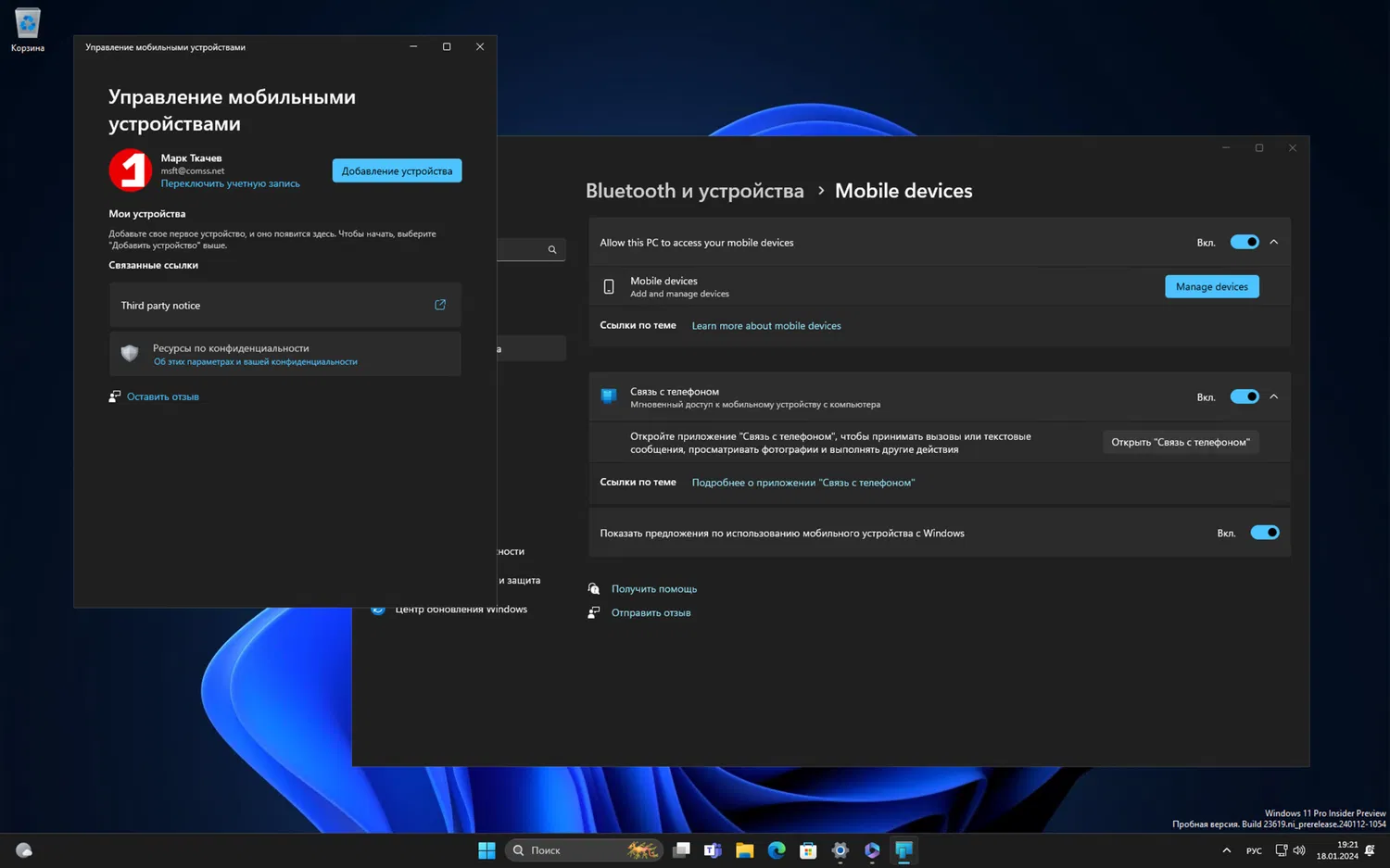 - Для активации этой функции необходимо перейти в "Параметры" > "Bluetooth и устройства" > "Мобильные устройства" (эта страница настроек была обновлена в Build 26016 на канале Canary и Build 23606 на канале Dev) и выбрать "Управление устройствами", разрешив доступ ПК к мобильному телефону Android. ПК получит обновление хоста межустройственного взаимодействия в Microsoft Store, необходимое для работы этой функции.