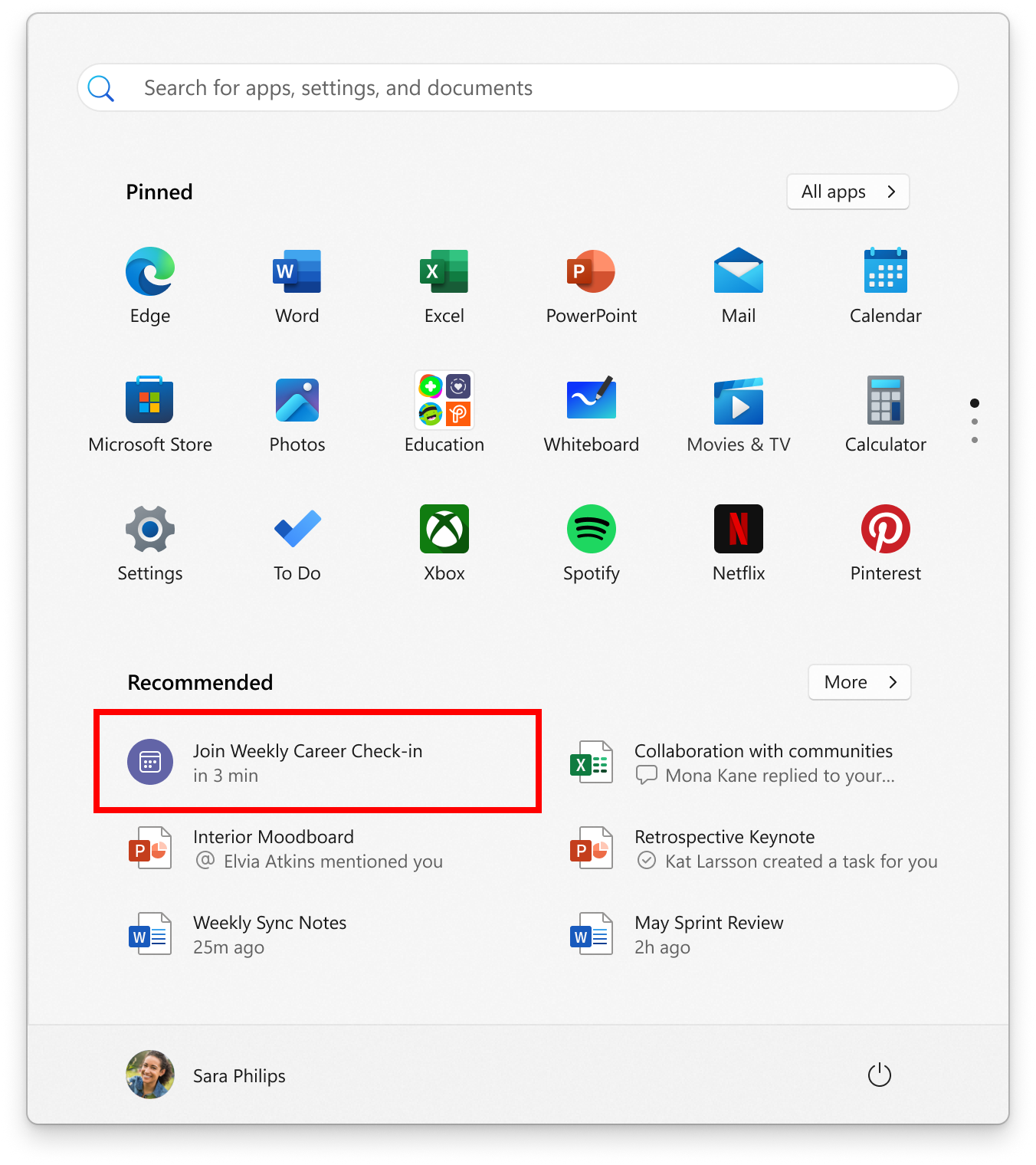 - Для пользователей, вошедших в Windows 11 Pro или Enterprise с помощью учетной записи Microsoft Entra ID, тестируется функция просмотра и присоединения к предстоящим встречам Microsoft Teams непосредственно из меню "Пуск". Следующая онлайн-встреча в Teams будет отображаться в рекомендуемых элементах за 5 минут до её начала, нажатие на рекомендацию встречи откроет процесс присоединения к встрече в Teams.