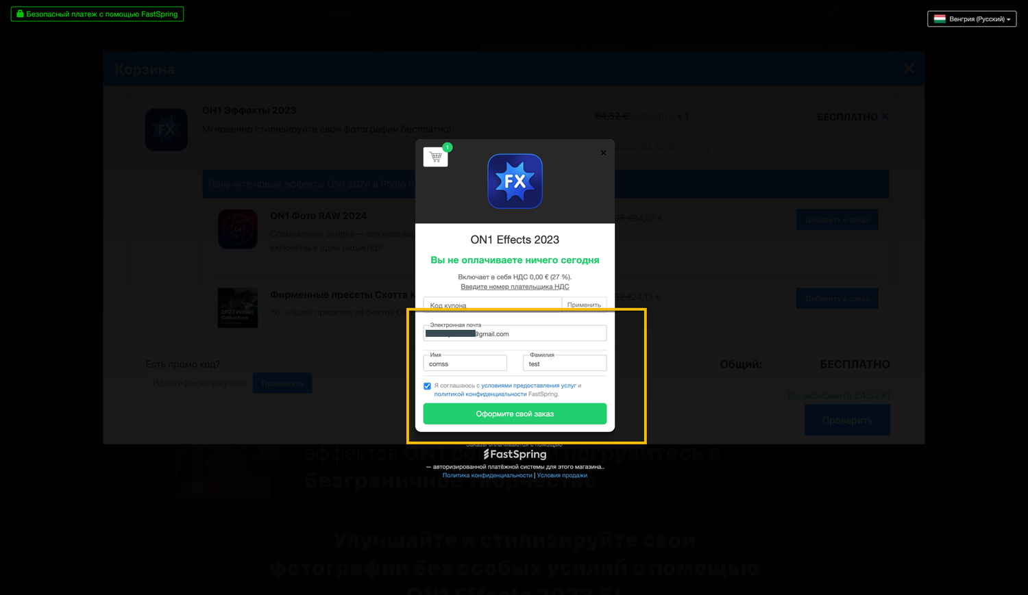 - Завершите оформление бесплатного заказа, указав адрес электронной почты от учетной записи ON1.