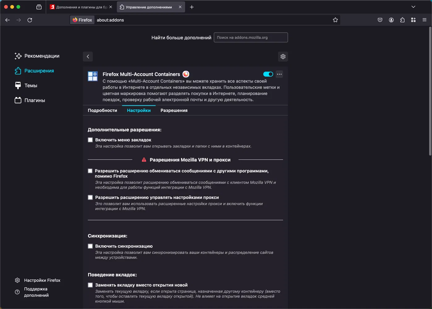 Для управления контейнерами нет пункта контекстного меню, вызываемого правой кнопкой мыши. Многие расширения, например uBlock Origin, OneTab, Violentmonkey, имеют страницу настроек, доступ к которой можно получить со страницы about:addons (нажмите Меню > Дополнения и темы). Но параметры расширения Firefox Containers недоступны с этой страницы.
