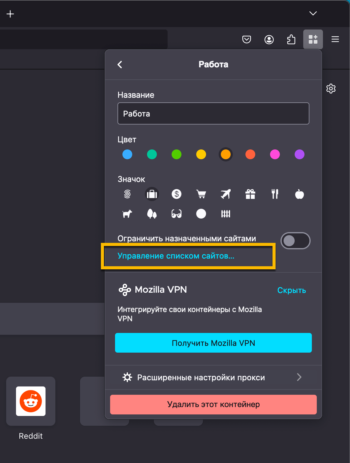 Вы можете использовать страницу настроек контейнера, чтобы изменить имя, значок, цвет контейнера, ограничить его доступ к определенным сайтам. Также можно настроить дополнительные параметры прокси-сервера или навсегда удалить контейнер.