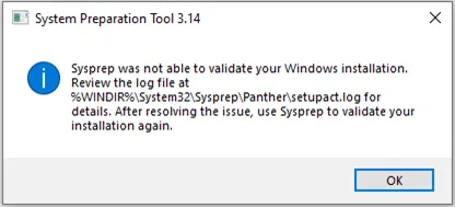 Sysprep не смог проверить вашу установку Windows. Подробные сведения см. в файле журнала %WINDIR%\system32\Sysprep\Panther\setupact.log. После решения проблемы используйте Sysprep для повторной проверки установки.
