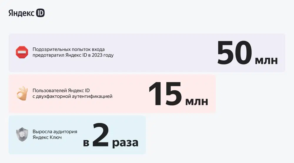 В 2023 году команда «Яндекс ID» значительно усилила меры безопасности, благодаря чему удалось предотвратить 50 миллионов подозрительных попыток входа в систему, затрагивающих свыше 20 миллионов аккаунтов. Это стало возможным благодаря внедрению новых инструментов безопасности и расширению использования двухфакторной аутентификации, которая теперь активирована у 15 миллионов пользователей. Помимо этого, наблюдается удвоение месячной активной аудитории приложения Яндекс.Ключ, предназначенного для усиления защиты аккаунтов.