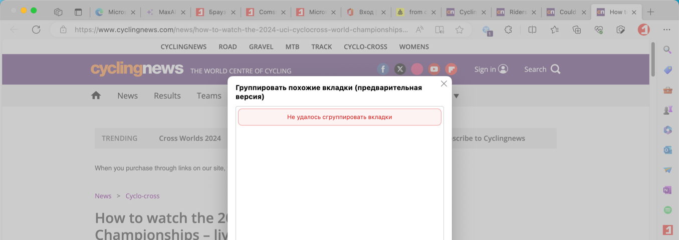Когда вы отключитесь от Интернета, функция Группировать похожие вкладки выводит сообщение об ошибке «Не удалось сгруппировать вкладки». Другими словами, обработка происходит на серверах Microsoft, а не локально.