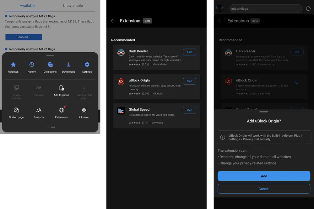 Теперь Edge для Android лучше соответствует настольной версии браузера, которая уже давно поддерживает широкий спектр расширений: от блокировщиков рекламы до инструментов повышения производительности. Это большой шаг вперед, который позволяет пользователям Edge улучшить свой мобильный просмотр с помощью тех же инструментов, которые они используют для повышения производительности и блокировки отвлекающей рекламы и трекеров на десктопе.