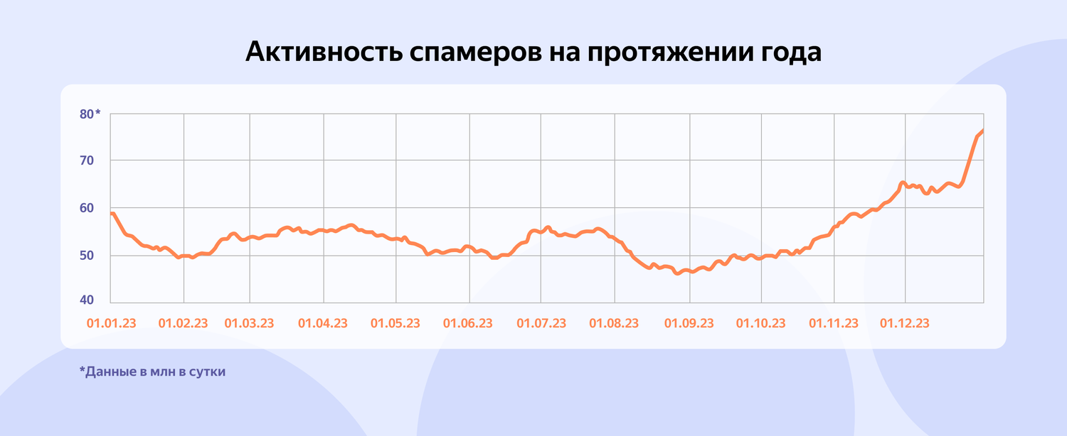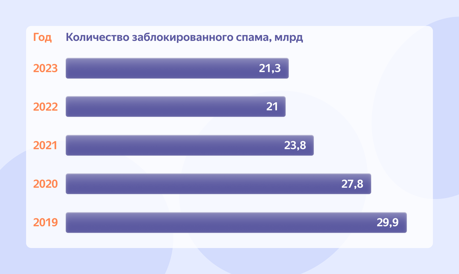 Аналитики Яндекс 360 отметили тенденцию к снижению объемов спама в электронной почте за последние пять лет, указывая на то, что в 2023 году количество спам-сообщений уменьшилось на треть (8,6 миллиарда писем) по сравнению с 2019 годом. Несмотря на это, методы мошенников стали более изощренными, как в плане содержания сообщений, так и в технологиях, позволяющих маскировать спам под обычные письма.