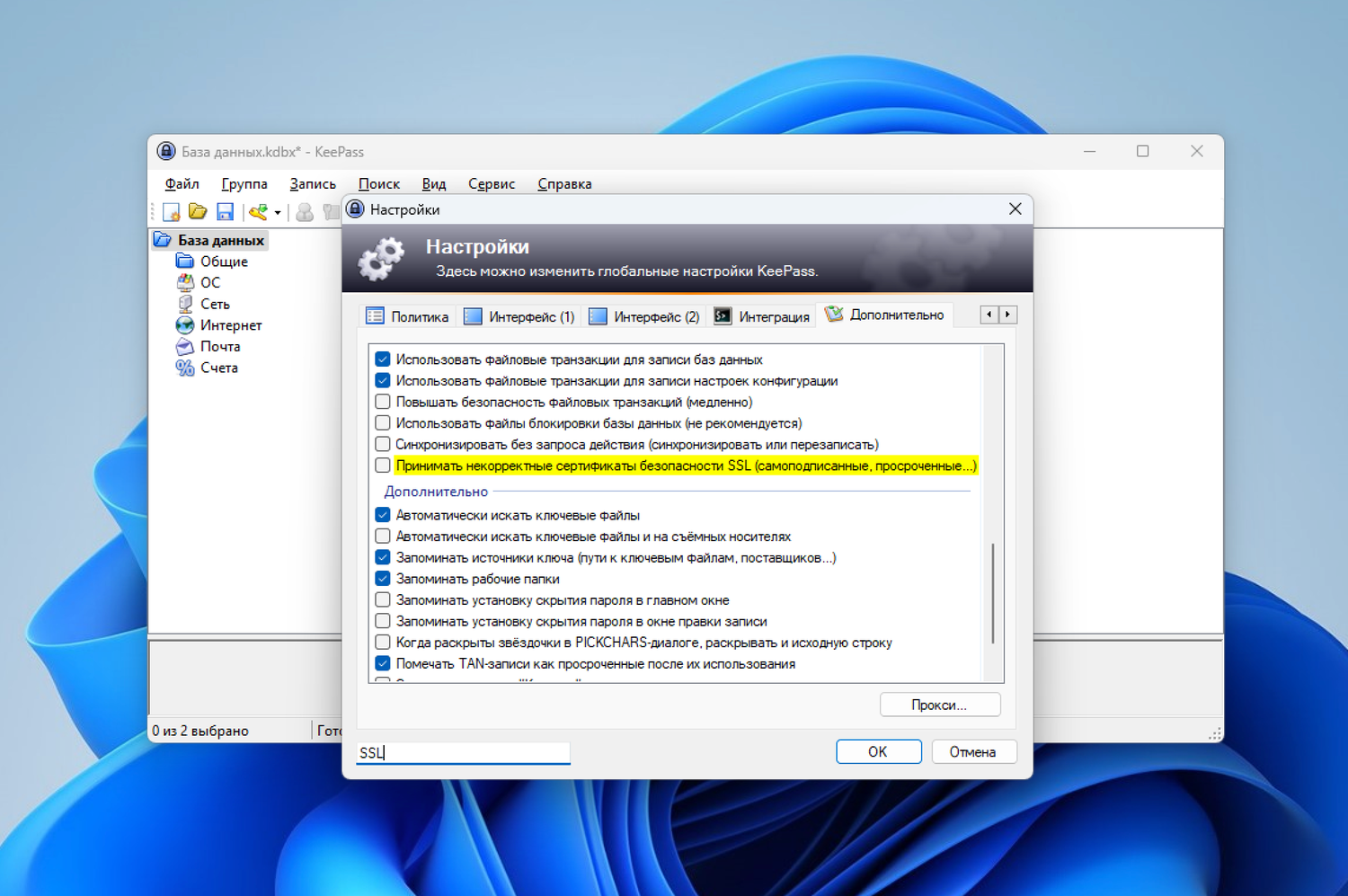 В KeePass 2.56 добавлен поиск по настройкам приложения. Вы найдете новое поле поиска в нижней части интерфейса параметров. Используйте его, чтобы найти
