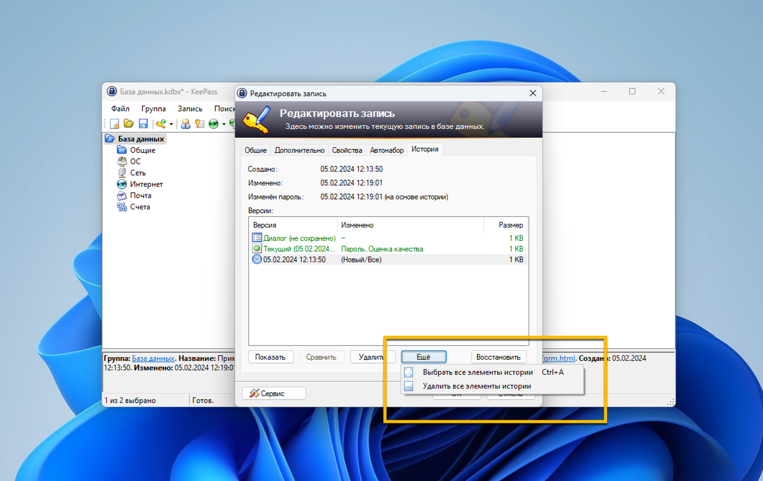 История в KeePass позволяет проверять предыдущие пароли и другие данные, например, после объединения двух баз данных KeePass.