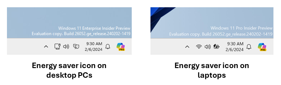 - Обновлен значок режима энергосбережения для настольных ПК (ПК без батарей). Этот значок отображается в системном трее, когда включен режим энергосбережения, в быстрых настройках и в "Параметры" > "Система" > "Питание".