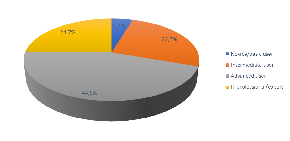 - Уровень знаний: Почти половина участников опроса описали себя как продвинутых пользователей, примерно по четверти пришлось на пользователей среднего уровня и профессионалов/экспертов.
