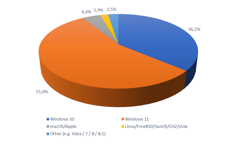 - Предпочтения в операционных системах: Большинство пользователей отдают предпочтение Windows 11 над Windows 10, при этом более старые версии Windows чаще используются пользователями, не считающими себя экспертами в области ПК.