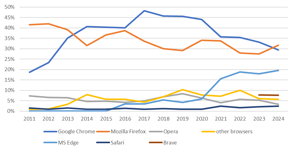 - Предпочтения в браузерах: Mozilla Firefox обошел Google Chrome по популярности, возможно, благодаря дополнительным функциям и аспектам безопасности.