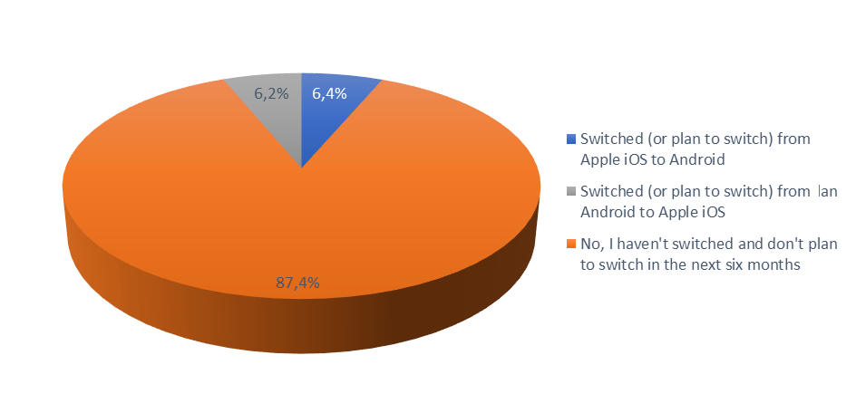 - Смена мобильной ОС: Большинство респондентов заявили о намерении остаться с текущей мобильной ОС, лишь немногие переходят с Android на iOS или наоборот (около 6% в каждом случае).