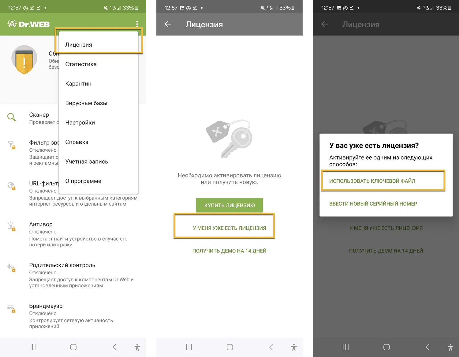 - Установите антивирус и укажите путь к предоставленному файлу лицензии drweb32.key в Меню > Лицензия > У меня уже есть лицензия > Использовать ключевой файл.